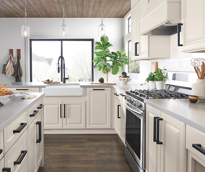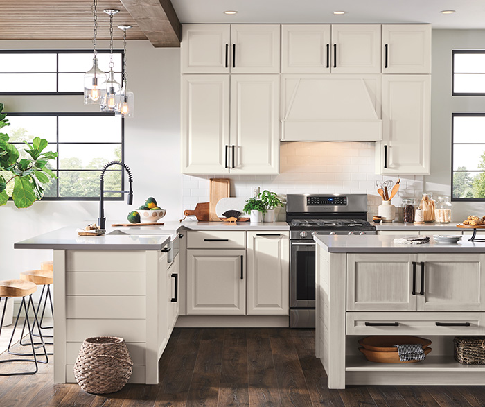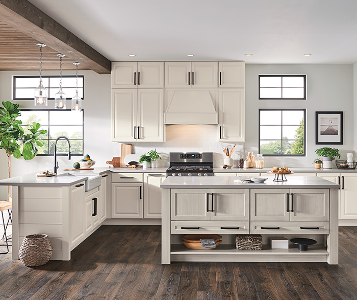 The Becket kitchen features stunning Icy Avalanche paint paired with Icy Avalanche Nightfall brushed finish, creating a sophisticated neutral palette that elevates any modern home. A statement island with designer open shelving and a raised panel door completes this transitional design, blending contemporary elegance with warmth and functionality.