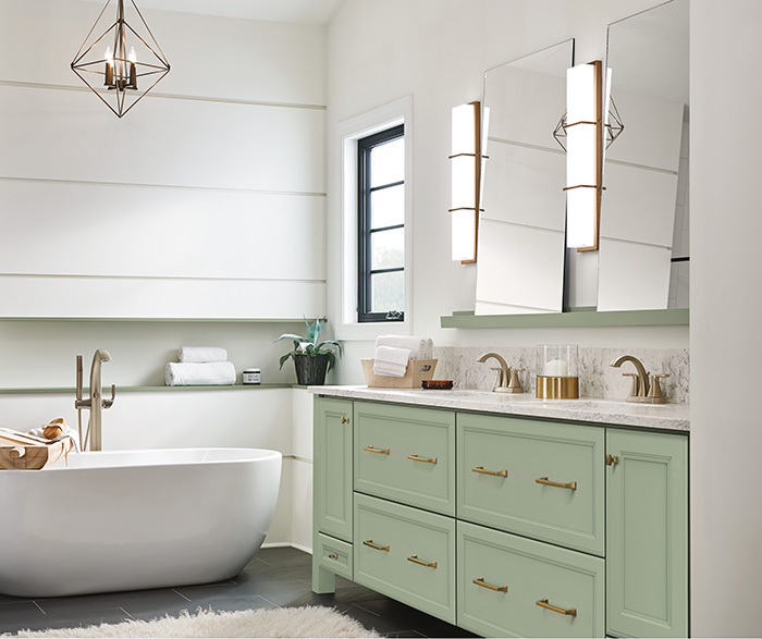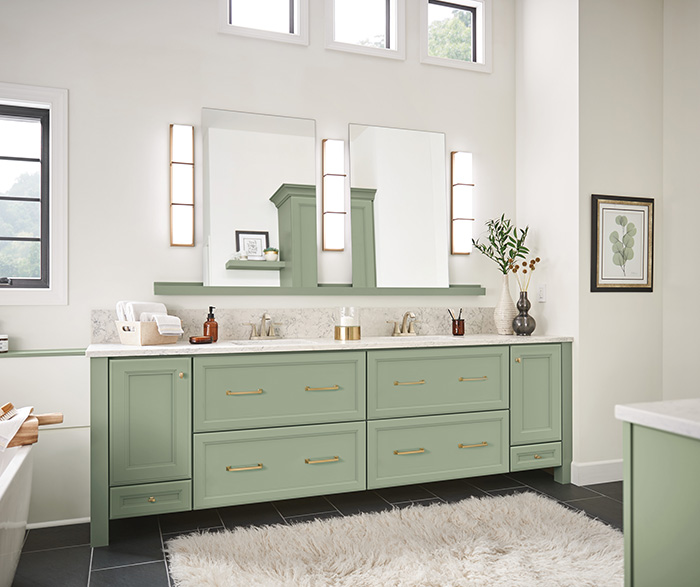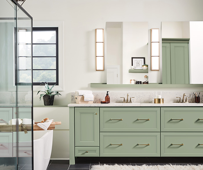 The Boone vanity in painted Coastal Plain finish brings serene spa-like elegance to this primary bathroom, featuring a spacious double vanity with ample storage and sophisticated sage-green cabinetry. Complete with a dedicated coffee bar, this luxurious retreat blends morning convenience with relaxation, creating the perfect start to your day.