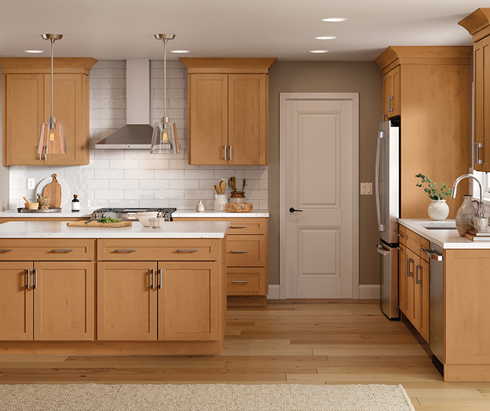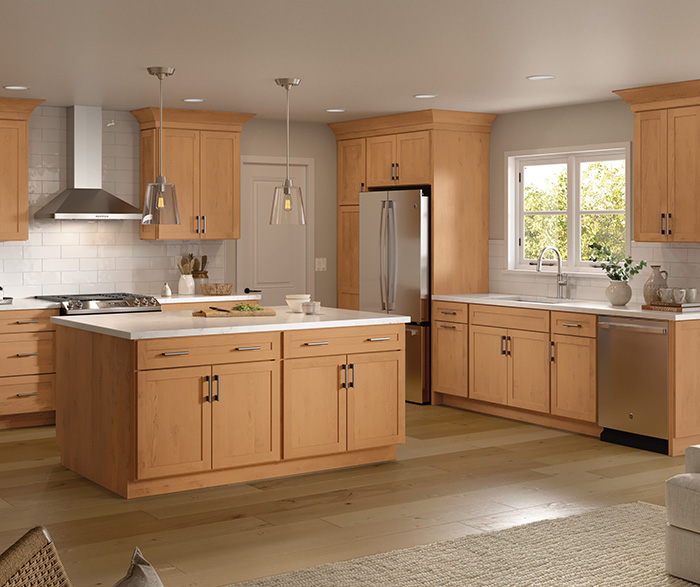 Bring a touch of elegance to your home with the Jamestown Shaker kitchen in a warm Sahara stained finish. This inviting L-shape design, complete with a functional island, offers both ample workspace and a stylish gathering area for your family and friends.