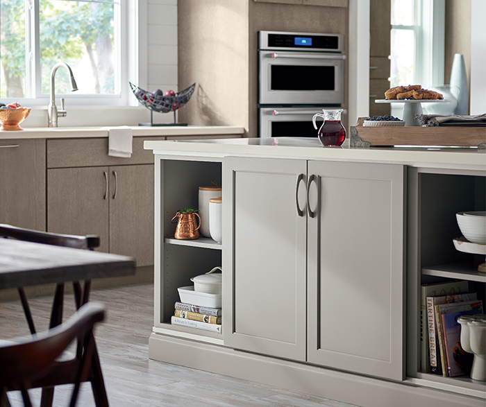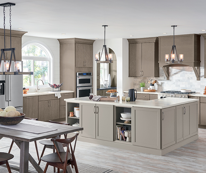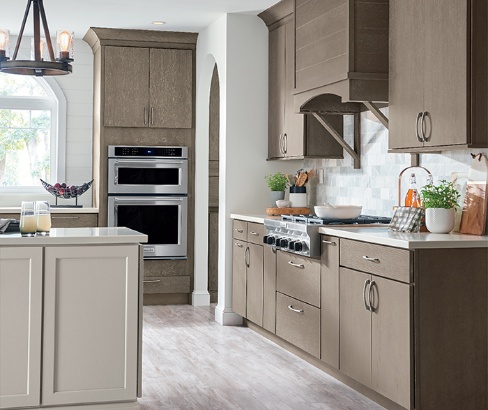 Farmhouse embellishments such as wood hoods and curved arches invite an air of authenticity into this room. A Seal Brindle finish further enhances a rustic appeal.